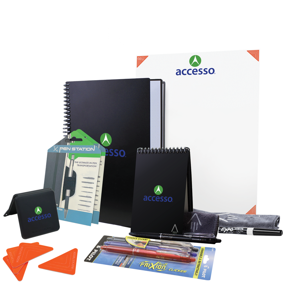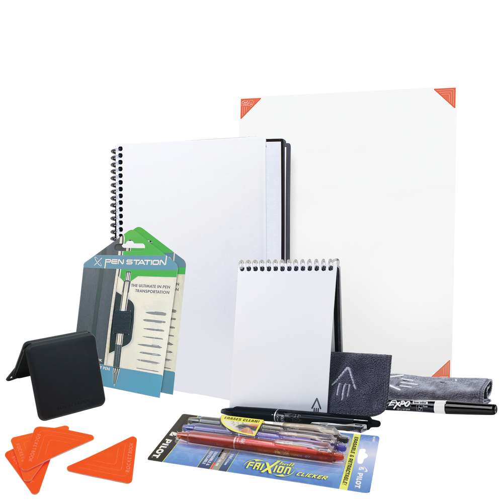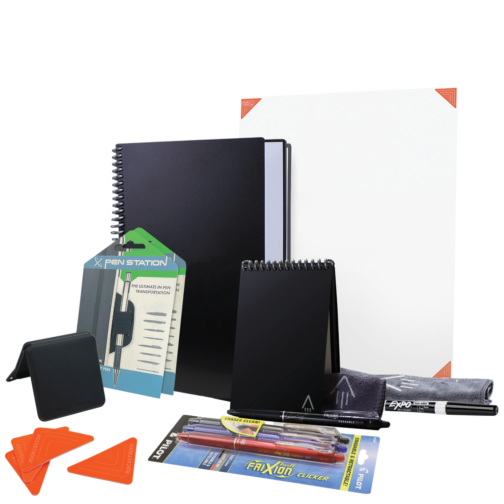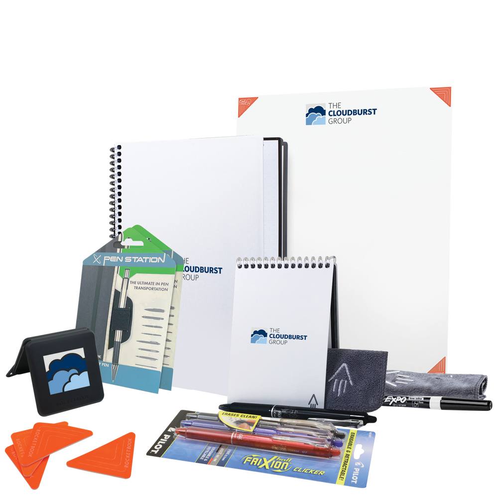 Build the ultimate reusable Holiday gift with the Executive bundle, and be everyone's favorite gift-giver this year. Write on the Core and Mini notebooks with any of the Pilot FriXion line, scan your notes into the cloud with our free app, and then use the included microfiber towel to erase your notes like magic! Also use the Beacons or the Thinkboard X2 for planning sessions or remote presentations. Brand all 4 Rocketbook products with your artwork to create a seamless transition and stay organized from in-person to remote. The possibilities are endless with digitally connected and reusable Rocketbook notebooks & accessories.