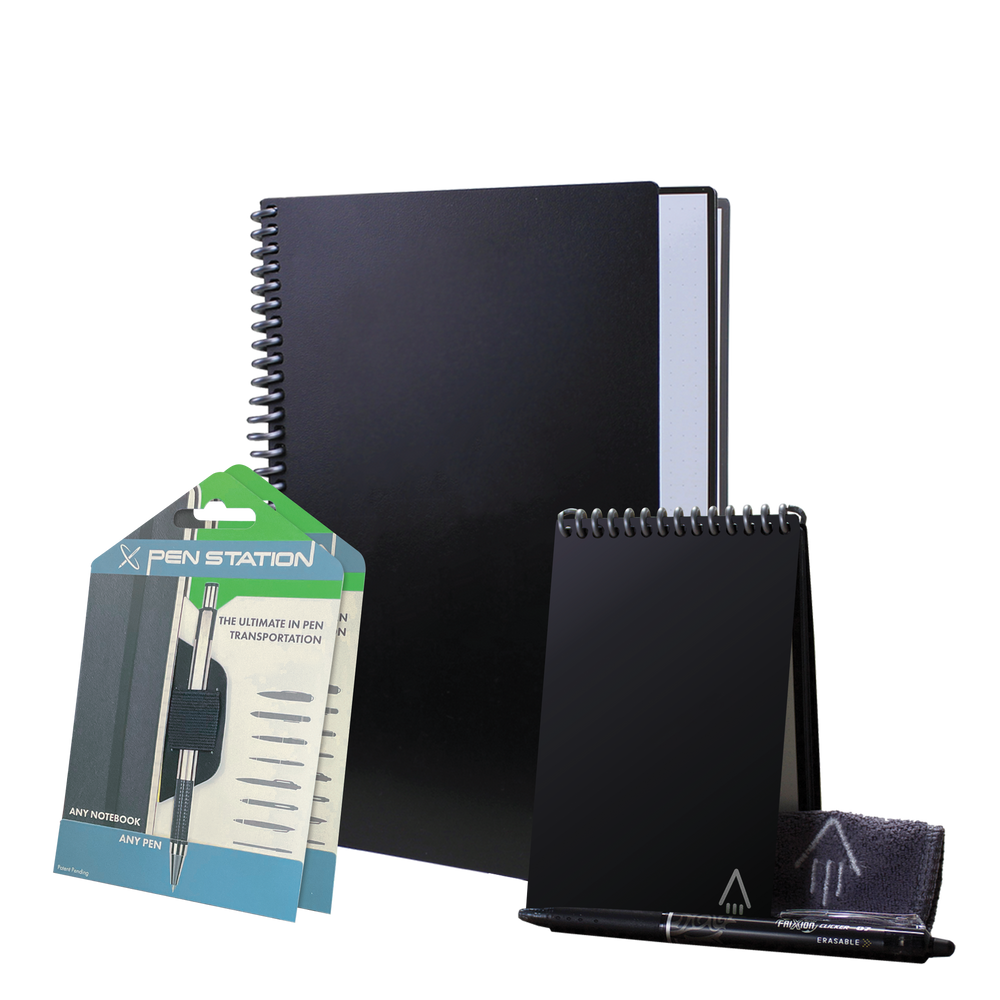 Launch your Rocketbook journey with our Starter Bundle! Write ideas, notes, plans, and more in our best-selling Core notebook or take your Mini for on-the-go writing anywhere. Scan with the free app and then use the included microfiber towel, some water, and watch your notes erase like magic. The included pen stations ensure that you will never lose your Pilot FriXion pens. Brand both the Core and the Mini to create the ultimate Holiday gift for your employees, clients, giveaways, and more!